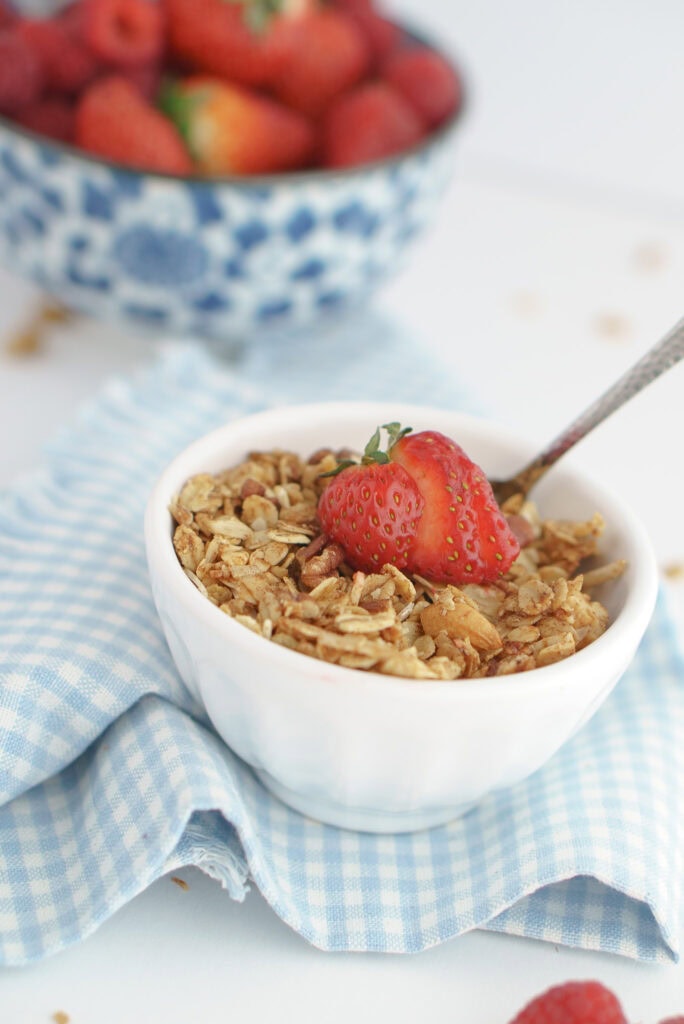Before making the cookies themselves, I pre-make the maple pecan granola a day or two ahead of time. The batch makes enough to have ample leftovers for yogurt that week. (In a pinch, you can use a high quality store-bought granola). You will need about 1 1/2 – 2 cups of granola for this recipe. Set aside.