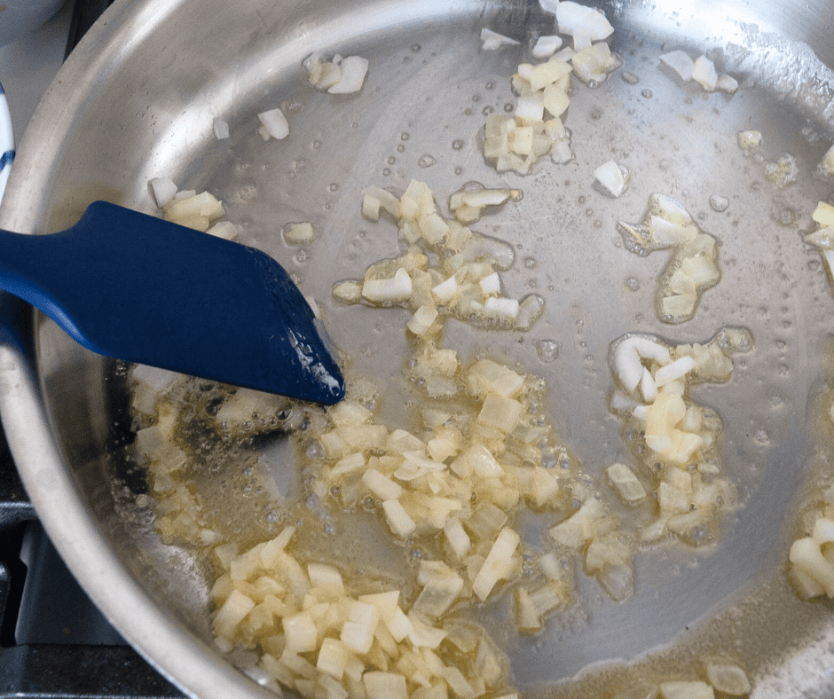 - Add diced onion and cook until soft and translucent, about 3–4 minutes.