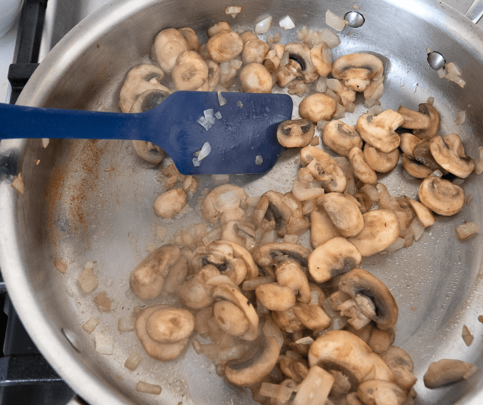 - Add mushrooms and cook until their liquid releases and evaporates and they turn lightly golden.