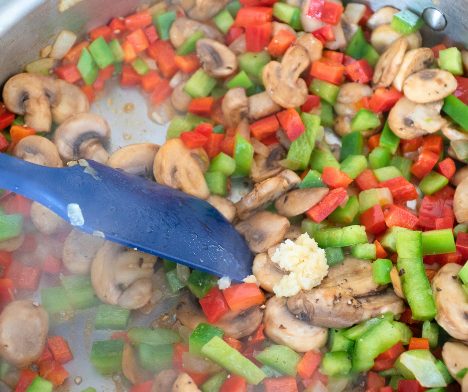 - Add green and red peppers; sauté 2–3 minutes until just tender. Add garlic and cook 30 seconds. Season lightly with salt and pepper. Set aside.