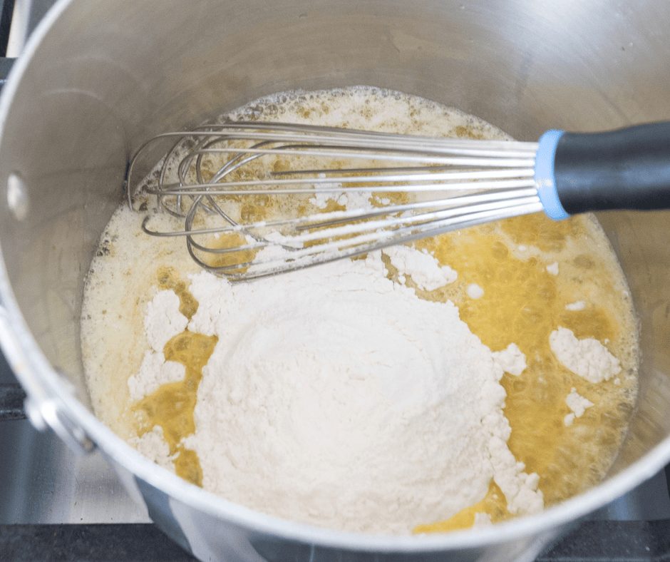 - Whisk in flour and cook 2–3 minutes, stirring constantly, until smooth and lightly golden (do not brown).
