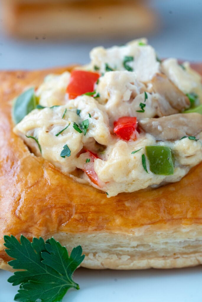 Spoon Chicken à la King into warm puff pastry cups just before serving. Garnish with additional parsley.