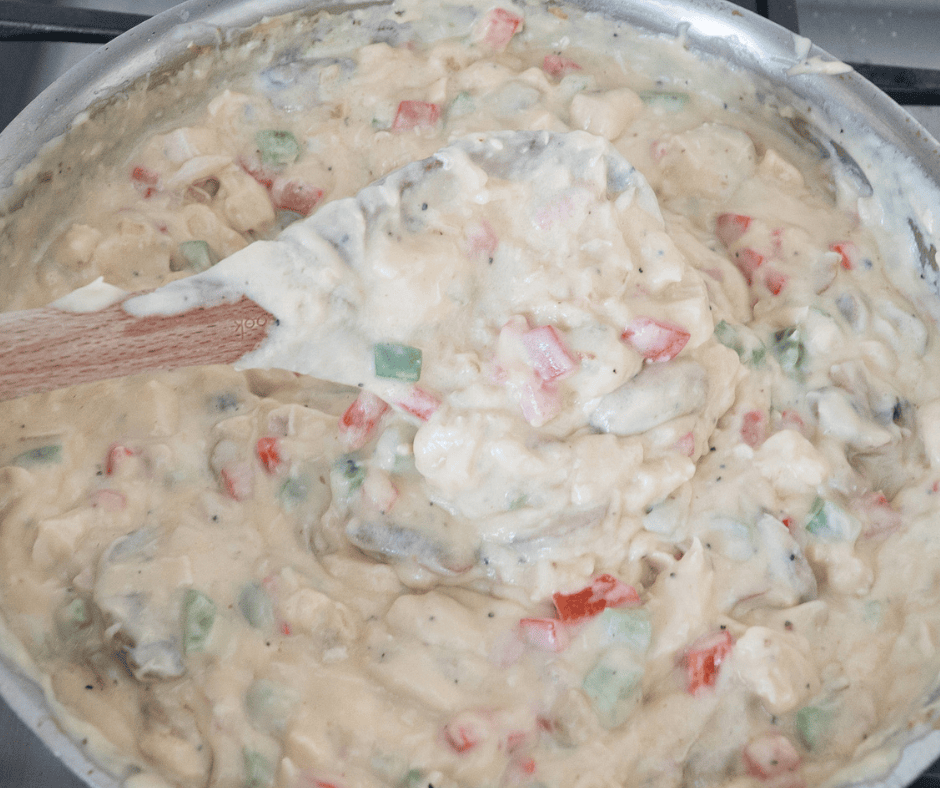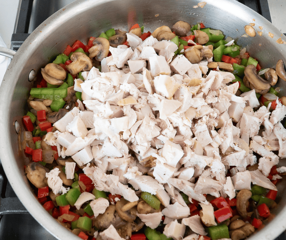 - Fold in cooked chicken and sautéed vegetables.