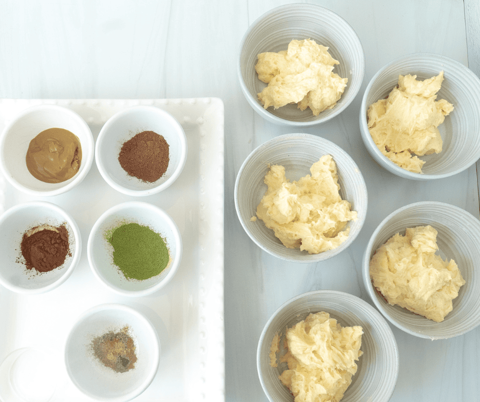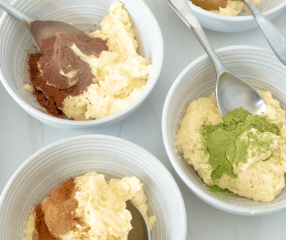 - Divide frosting into bowls and mix in flavor variations.