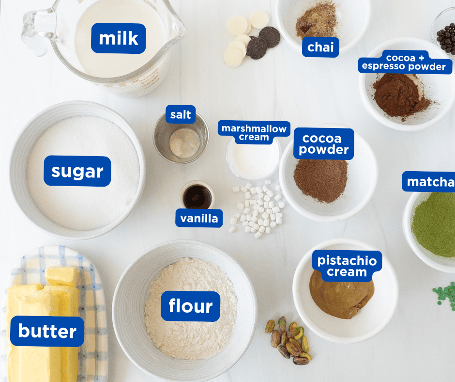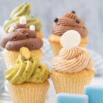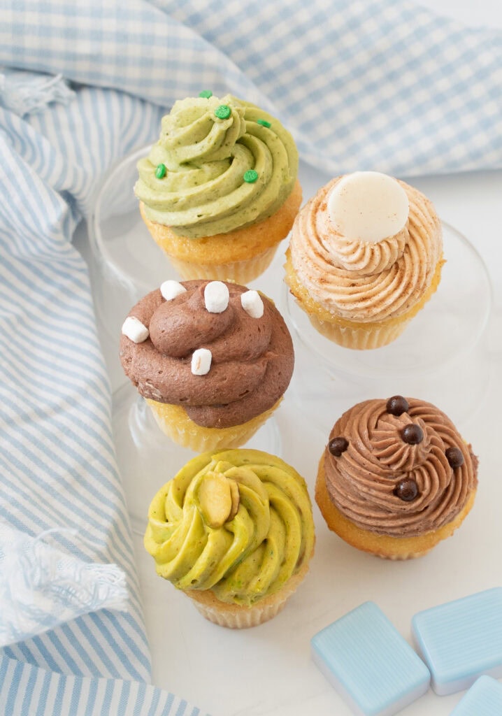 A café-inspired cupcake flight featuring soft vanilla mini cupcakes topped with silky ermine frosting. One base recipe is divided into five flavors – mocha, matcha, pistachio, chai, and peppermint hot cocoa – for a playful, shareable dessert experience. Perfect for gatherings, dessert boards, or an interactive tasting-style treat.