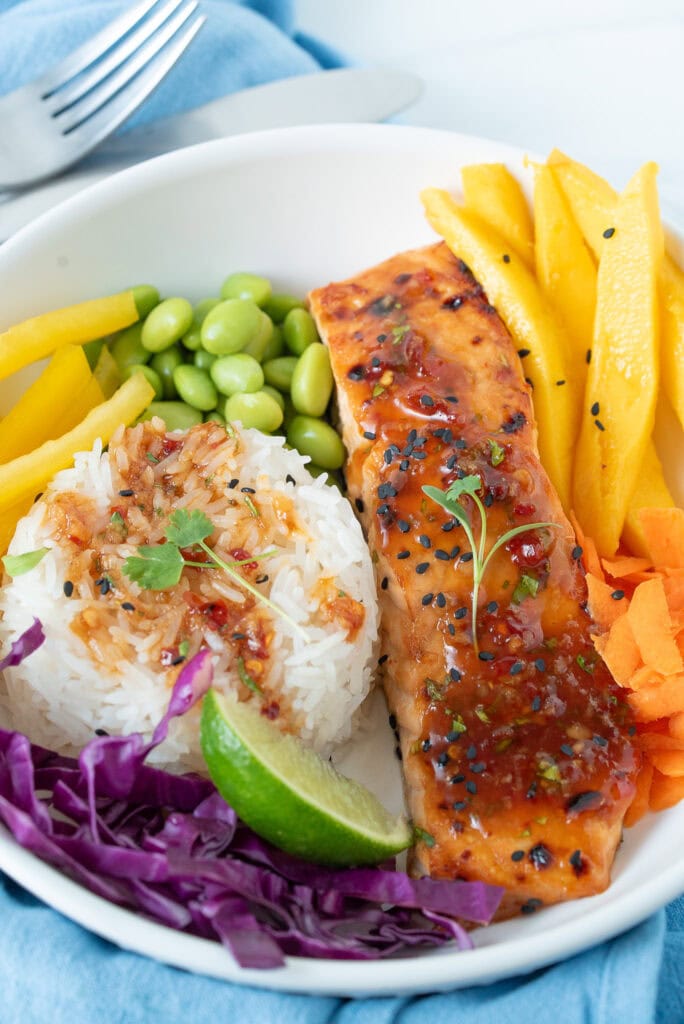 Quick, fresh, and full of flavor, these Thai Salmon Rice Bowls are a family favorite year-round. Tender broiled salmon meets vibrant vegetables, tropical mango, and a bright, tangy sauce for an easy, show-stopping meal.